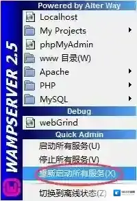 4、找这两个服务,如果有,就查看它是否已经启动,没启动就将它启动。如果没有那就需要安装服务(就接着看下面的步骤);5、这两个服务丢失的重新补救方法如下:左键单击任务栏的wampserver服务器图标,然后选择Apache,service–〉安装服务;