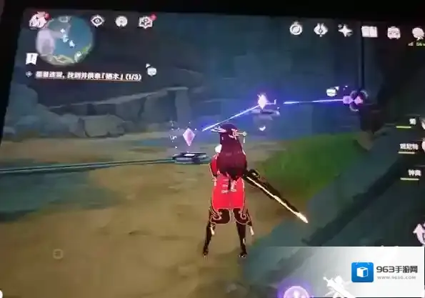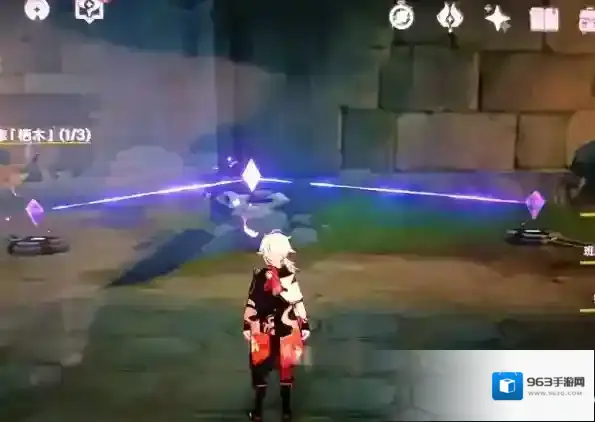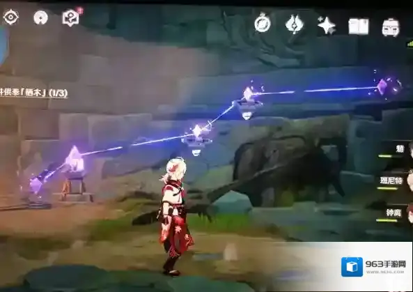 接着跟着羽毛走,我们又来到一个继电石解密处,按着之前的思路,先找仙灵(一个仙灵在石头堆里,可以用元素视野看,另外两个好找),开启机关。水位下降后,我们一共找到了三处导线断处,但是只有两个继电石,因此我们需要自己充当第三块继电石,三个位置可以随意调换,下面是我填充继电石图解(没有继电石的图是北斗放e充当继电石处)
