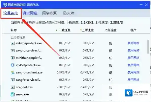 在弹出的界面中,点击上方的“流量监测”,这时就可以看到所有打开着的程序访问网络的状态了。