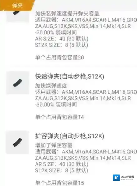 因为配件种类较多,这里就不一一赘述。而配件重量普遍偏高,例如步枪快速扩容为20,狙击枪快速扩容弹夹为23等等。所以一般情况下帮助队友携带配件尽可能不要太多,避免占据较大的空间。