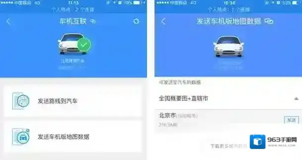 步骤三:进入工具箱选择连接汽车。成功后进入下图页面,选择将手机版的离线数据发送给车机版。
