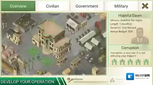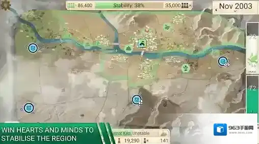 游戏中玩家们将会来到自己选择的区域当中,成为这里临时的治理者,通过建设民生、发展政府项目来发展该区域,获得人民们的支持,提高自己的声望;同时还要去训练军队,建设防御设施,消灭一切妄想占领该区域的反叛军,保持地区的稳定性。游戏的可玩性和策略性十足,体验起来非常的精彩!
