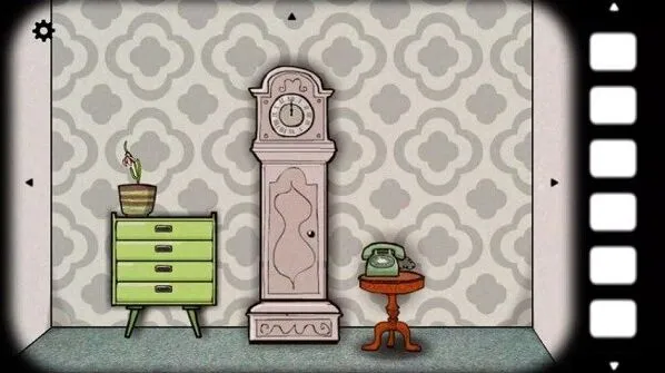 2、我们先是默认的面对有大型钟的这面,先点击盆栽柜子,在柜子抽屉里面我们能拿到火柴和勺子。接着我们点击右转镜头到另一面面对窗户的房间,打开墙上的灯泡按钮开灯,点击向上按钮,从天花板的灯罩里面取得一块相片碎片,接着回到窗户这里,再点击一次窗户,会飘出一片相片碎片。