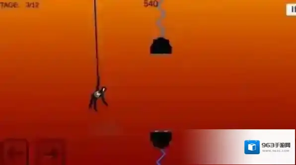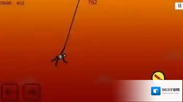 2、操控火柴人,点击右侧方块按钮,释放/收回蜘蛛丝,让角色在场景中摆动,跨越障碍,注意把控点击节奏,保持角色移动轨迹。