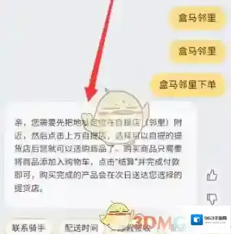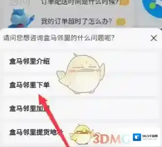 3、在客服中心输入“盒马邻里”并发送,选择需要咨询的问题。