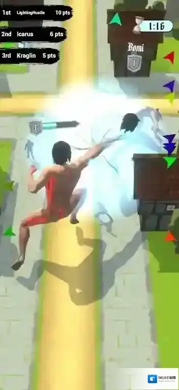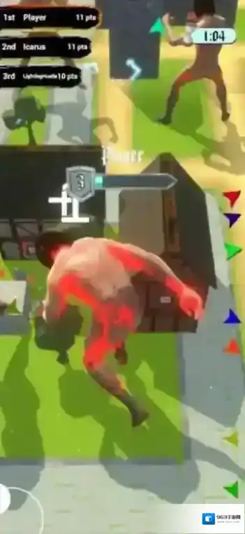 3、画面中角色身上有红色特效,处于战斗场景,左上角显示排名和得分,分别是“1stPlayer11pts”“2ndIcarus11pts”“3rdUraniumium10pts”,场景中有房屋等建筑。