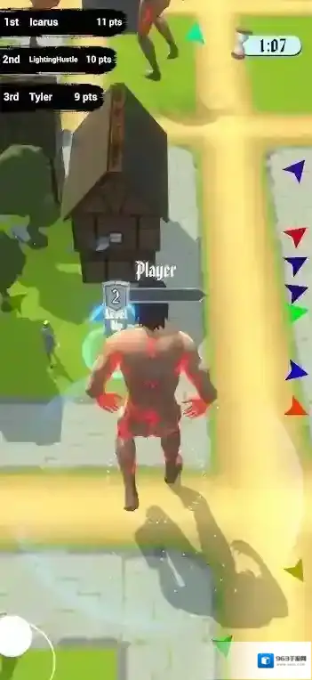 2、左上角显示玩家排名和得分,右上角显示倒计时“1:07”,画面中角色背后有特效,角色上方有“Player”标识,还显示“Levelup”(升级)。
