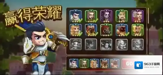 2、阵容界面,选中箭头指向的英雄,点击“GO”,带领队伍参与战斗,“赢得荣耀”,获取奖励提升战力。