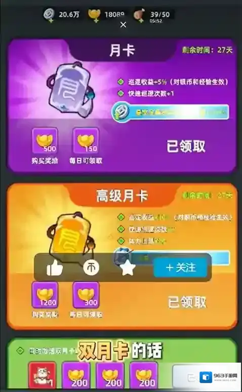 月卡:游戏提供标准月卡、高级月卡等多种选择,具体权益可在游戏页面查看。