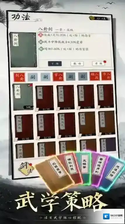 2、数百种不同的武学可以让你自由搭配来闯关,每一种武学招式都可以让你自由选择来使用。