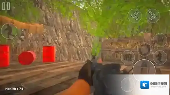 3、正式开始后左边控制角色的移动,右边是射击、跳跃、蹲下、换弹、近战、互动按键。