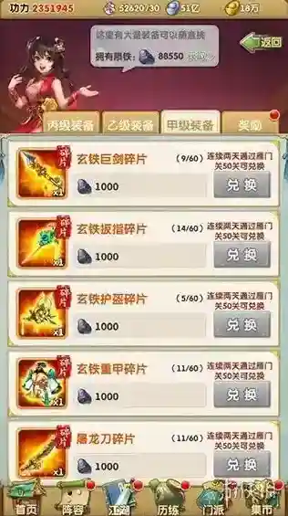 血战装备兑换通过消耗陨铁兑换装备碎片,合成获得整件装备。