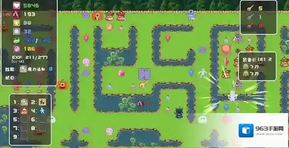 3、屏幕左上方是你的角色属性,当你的攻击力大于怪物数字时可以无伤击败。